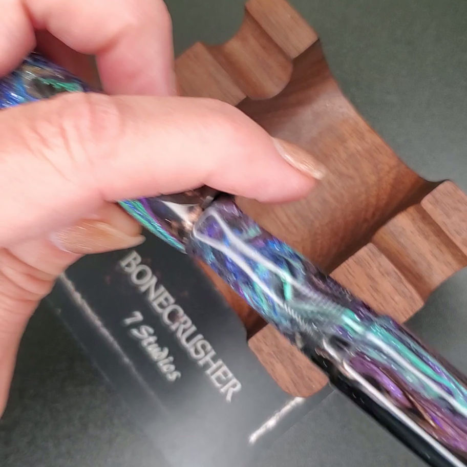 Velma model made for a #6 JoWo nib in "Midnight Oil" resin by Turnt Pen Co - a deep black resin with swirls of purple, green, pink, blue and yellow. Pen comes with choice of a silver or gold nib in your preferred size, and choice of BC7 finial color. Rose gold and black nibs are available for a $5 increased price.