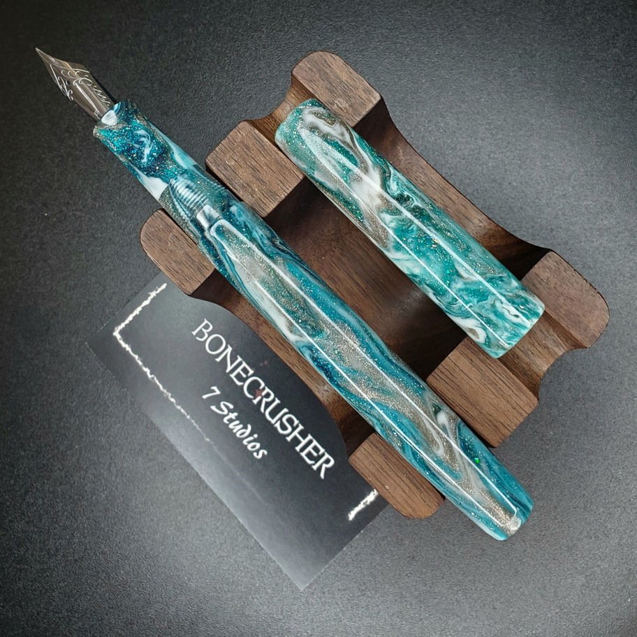 Olive model made for a #6 JoWo nib in "Emerald Isle" resin by McKenzie Penworks. A deep emerald green, pearl white, and brilliant silver mixed together in a swirling pattern - real silver and diamond are added to colors in this blank for a finished product that is simply outstanding. Pen comes with a choice of a silver or gold nib in your preferred size and your color choice of BC7 finial. Rose gold and black nibs are available for a $5 increased price. Our Olive model is a slightly slimmer version of our Velma - being a 13mm pen vs. the 14mm Velma. If you would like more information as to all the specifics, feel free to reach out to us!