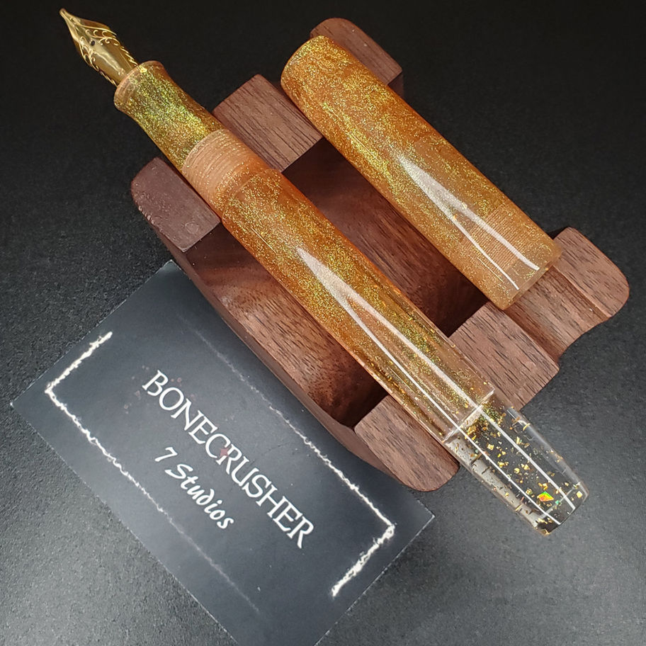 Velma model made for a #6 JoWo nib in "Frankincense and Myrrh" resin - an in-house cast by Bonecrusher 7 Studios. A shimmering gold with with flecks of golden glitter - complete with your color choice of BC7 finial. The body is internally polished to be used as an eye dropper to show off your favorite ink. Pen also comes with a choice of a silver or gold nib in your preferred size. Rose gold and black nibs are available for a $5 increased price.