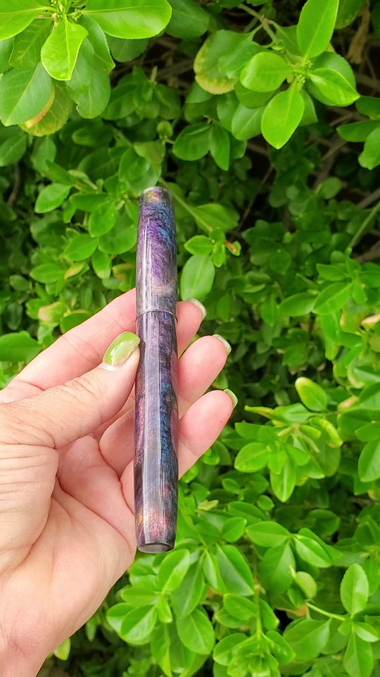 Velma model made for a #6 JoWo nib in "IGAI-1" resin by Bonecrusher 7 Studios. A vibrant multicolor shifting pen - blue, purple, pink, green, and gold. Pen comes with choice of a silver or gold nib in your preferred size and color choice of BC7 finial. Rose gold and black nibs are available for a $5 increased price.