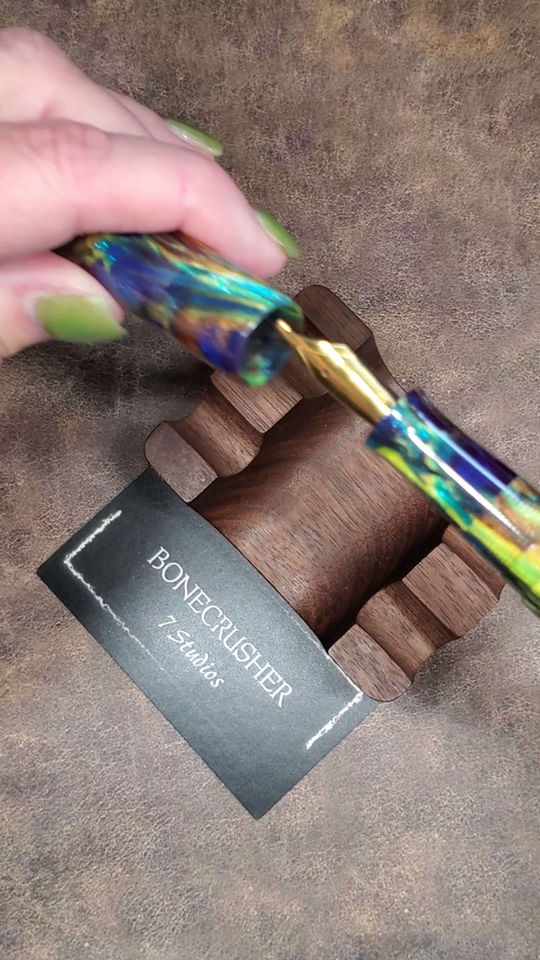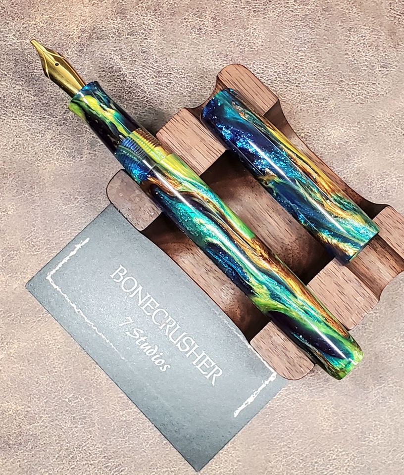 Velma model made for a #6 JoWo nib in "Belize Cenote" resin by Bob Dupras. Bright blues, green, copper and gold with flecks of glitter - complete with your choice of BC7 finial. Pen also comes with choice of a silver or gold nib in your preferred size. Rose gold and black nibs are available for a $5 increased price.