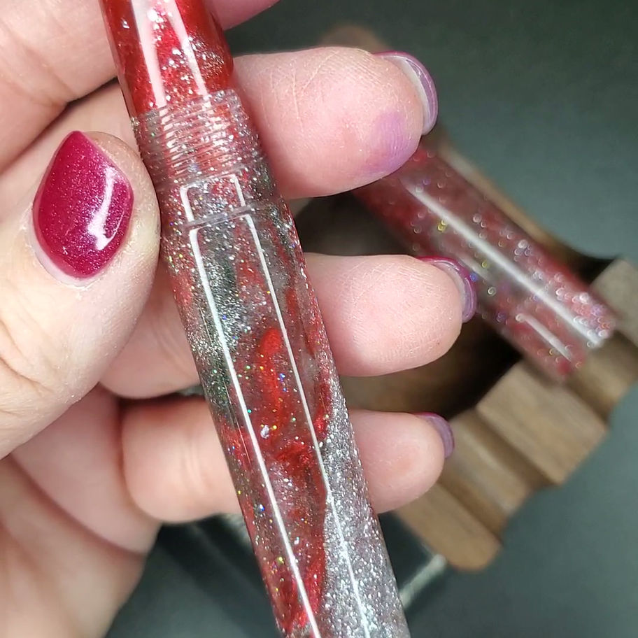 Velma model made for a #6 JoWo nib in "Vinterfest" resin by Pourly Controlled. Red and green with silver ribbons interspersed along with a transparent leaning glitter layer. Pen comes with a choice of a silver or gold nib in your preferred size and your color choice of BC7 finial. Rose gold and black nibs are available for a $5 increased price.
